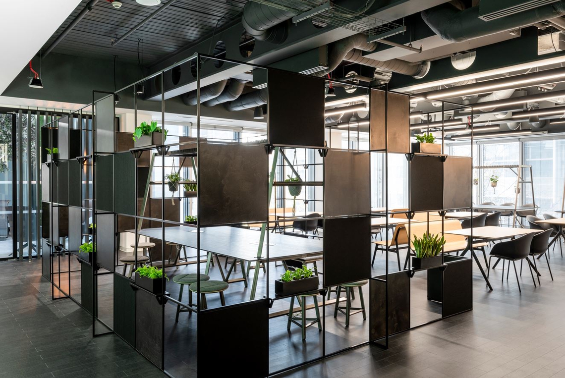 Designed to create a feeling of 'architecture within architecture', a different, 2D style Palisades construction is used elsewhere in the breakout area to essentially create a separate room within the open plan space. With the addition of large acoustic panels, MFC accessories and planting shelves, it provides visual and acoustic privacy to the collaboration area at the centre of the configuration.