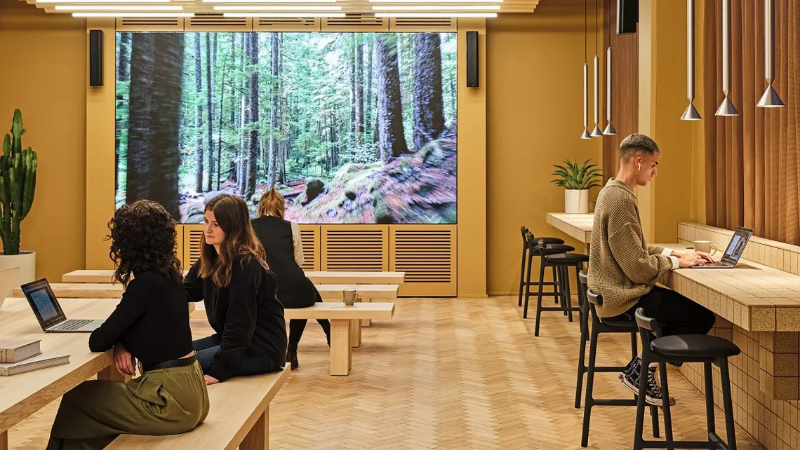 The Recharge Room to enjoy an atmospheric escape. The Oxygen Room for a boost whilst connecting with nature. The Café in olive yellow, cue that much-needed cuppa! Even a courtyard so employees can meet and work in the open inspired by the outdoors.