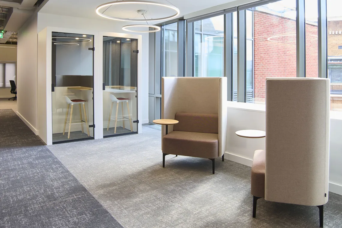 Working with Day2, Spacestor integrated into Portico booths the floorplate, offering users private, acoustically balanced havens for focused work, a quick call or confidential conversations. A sleek yet functional design complements the space, with white frames blending into the backdrop, producing a polished and professional result.