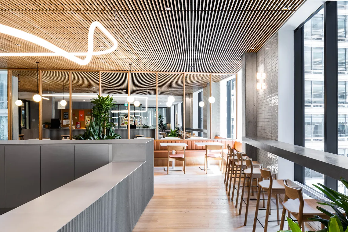 The preliminary environments are shared spaces. The café has an open feel with varied seating options to give the ‘coffee shop’ experience. The central island area and breakout tables, for socialising as well as focused productivity and team networking amongst the café buzz. Bleacher seating of birch ply, beautifully blend into the organic setting, are modular and ideal for scrum working.