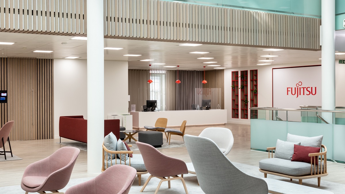 A flexible and collaborative working environment, with a soft and biophillic color palette for world-leading information technology provider, Fujitsu